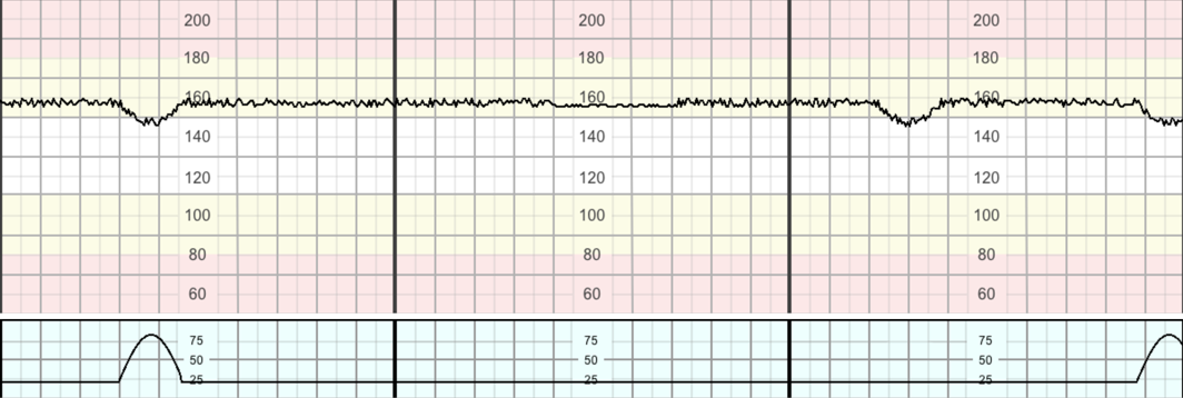 Presents as a baseline rate at the upper end of normal associated with reduced variability and blunted responses (infrequent accelerations and lack of cycling) and is frequently associated with shallow decelerations.