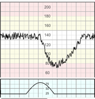 This can cause a sudden drop in maternal blood pressure which causes redistribution of maternal blood away from the placenta resulting in inadequate placental perfusion. It will present as a single and sudden drop in the baseline rate (acute hypoxia). In this instance, it is reversible and should be corrected by changing the maternal position and IV fluids ± I.V. ephedrine (to be administered by the anaesthetic team). Greenwell et al. 2012 This vasodilation can also cause an increase in maternal temperature as a result of altered thermoregulation. RCOG 2015