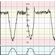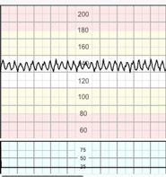 Some authorities consider a “pseudo-sinusoidal pattern” as the presence of accelerations with sinusoidal patterns. The presence of “saw toothed” or “Poole shark-teeth” pattern, is termed “atypical sinusoidal pattern” by some authorities, caused by fetal hypotension occurring secondary to acute feto-maternal haemorrhage and conditions such as ruptured vasa praevia. Yanamandra and Chandraharan 2014 This pattern has been described after analgesic administration to the mother, and during periods of fetal sucking and other mouth movements. It is sometimes difficult to distinguish the pseudo-sinusoidal pattern from the true sinusoidal pattern, leaving the short duration of the former as the most important variable to discriminate between the two. FIGO 2015