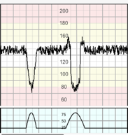 Variable decelerations constitute the majority of decelerations during labour, and they translate a baroreceptor-mediated response to increased arterial pressure, as occurs with umbilical cord compression. FIGO 2015 They are believed to occur secondary to baro-receptor and/or peripheral chemo-receptor stimulation. They are seldom associated with fetal hypoxia/acidosis, unless they evolve to exhibit a U-shaped component (“sixties” criteria) with a reduced or an increased variability within the deceleration (see late decelerations below), and/or their individual duration exceeds 3 minutes FIGO 2015, Hamilton et al 2012 (see prolonged decelerations below).